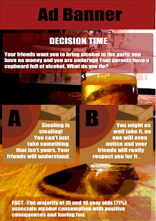The first decision page that will be seen is decision page 1 (D1) as you can see from the image below the decision page contains a short description of what is going on is the sequence. On D1 the text reads 'Your friends want you to bring alcohol to the party, you have no money and you are underage, your parents have a cupboard full of alcohol. What do you do?' The user then has to decide what choice to pick (see above examples) once the user has decided he will simply click on the choice he wants and sequential video will be played. Each decision pages will contain a randomly generated fact that can be seen at the bottom of the page.